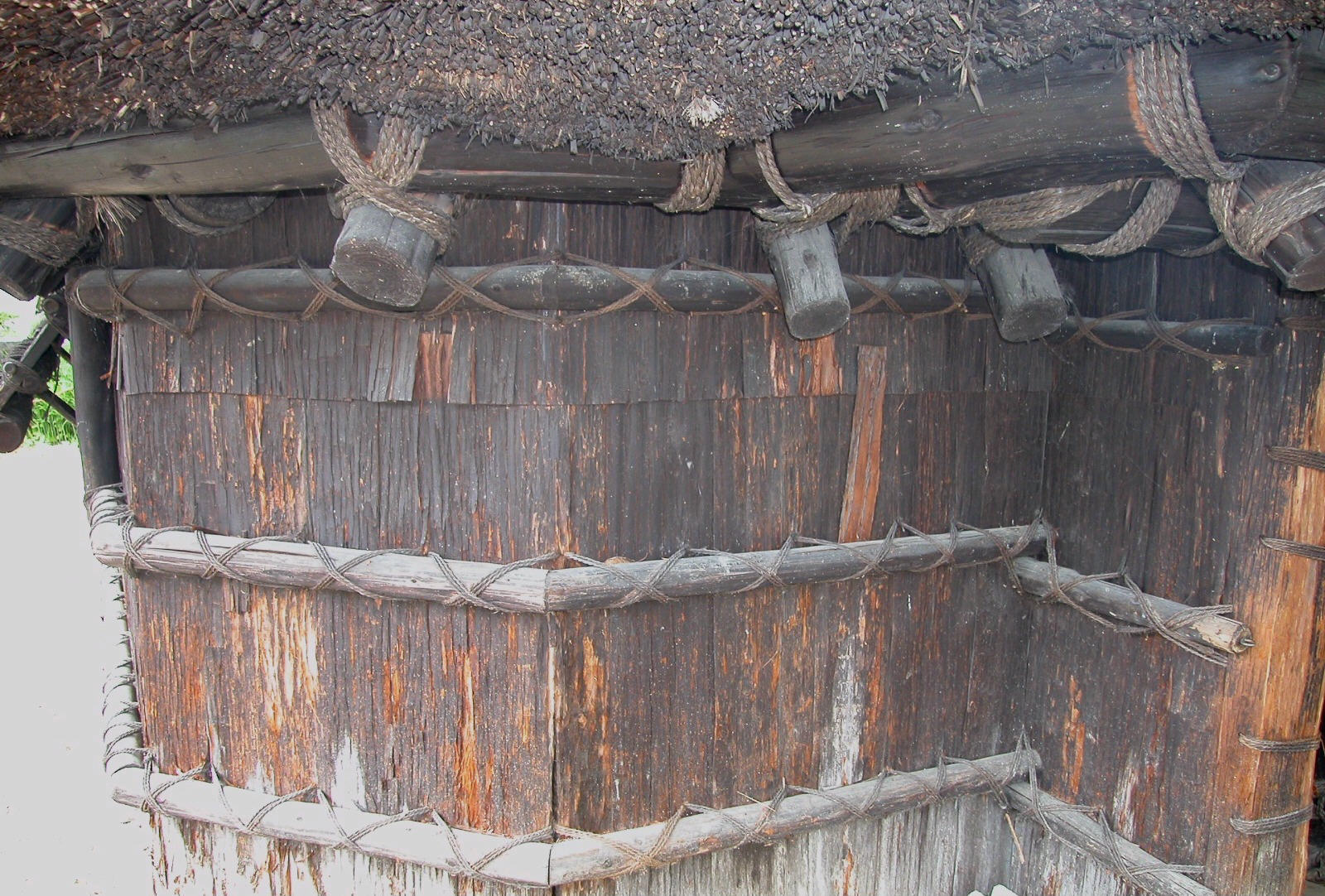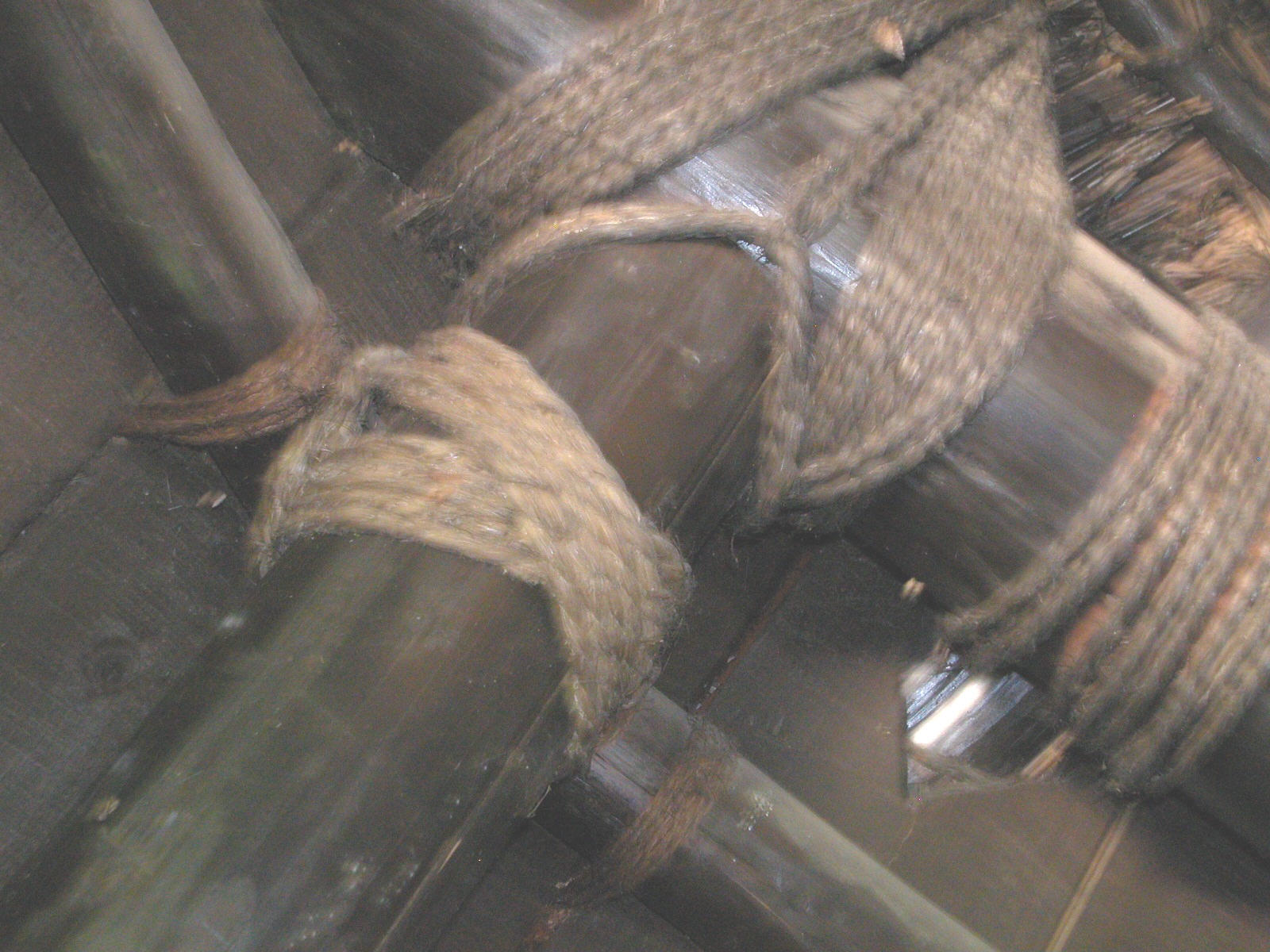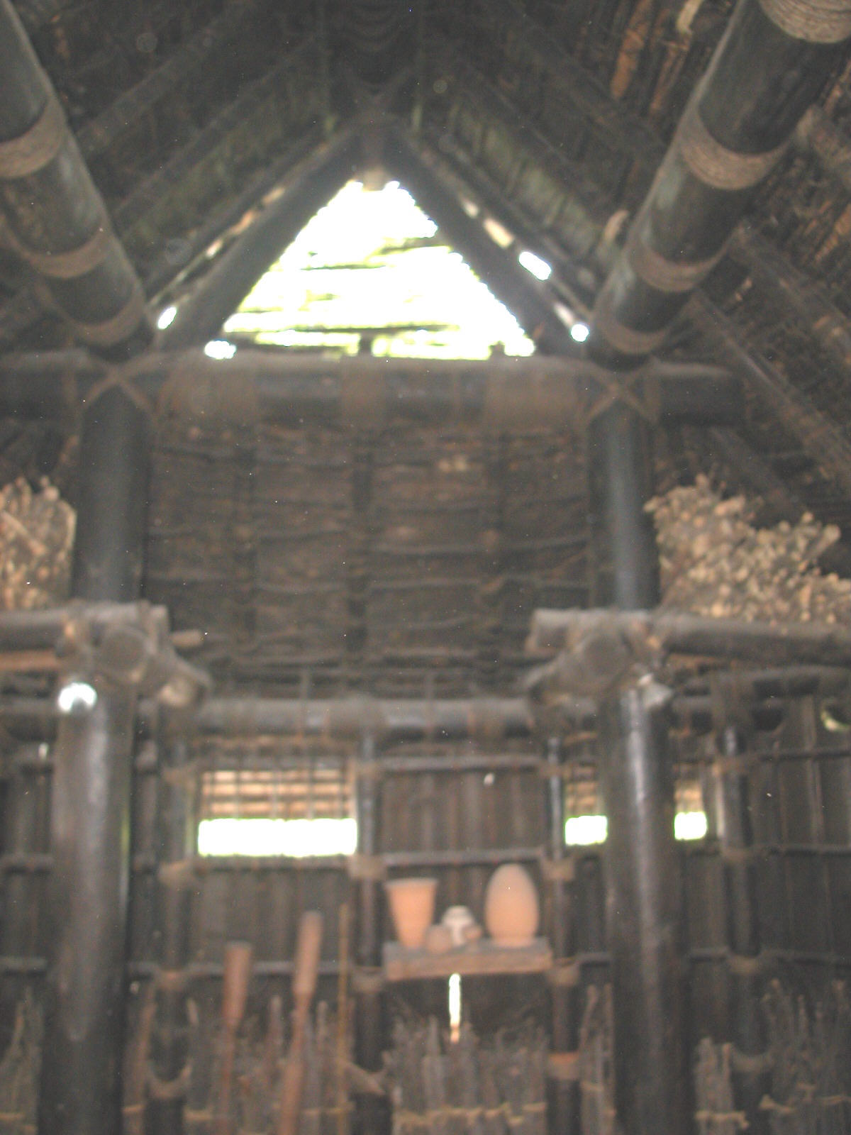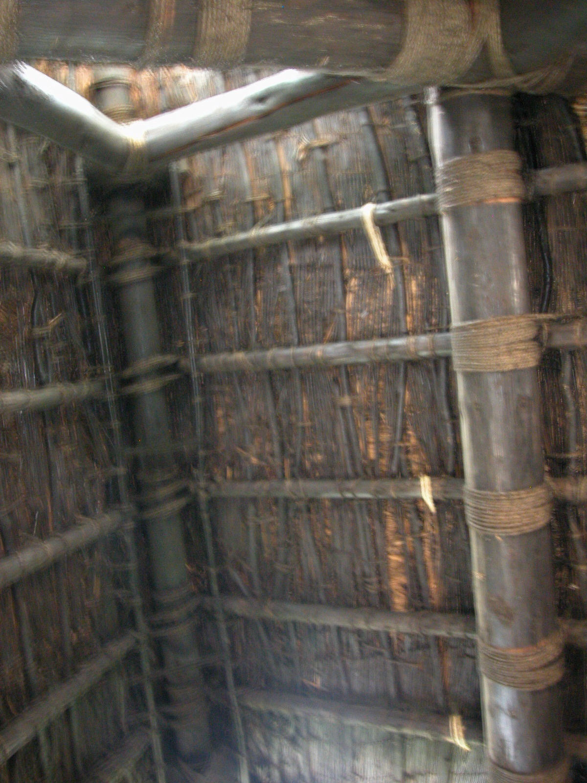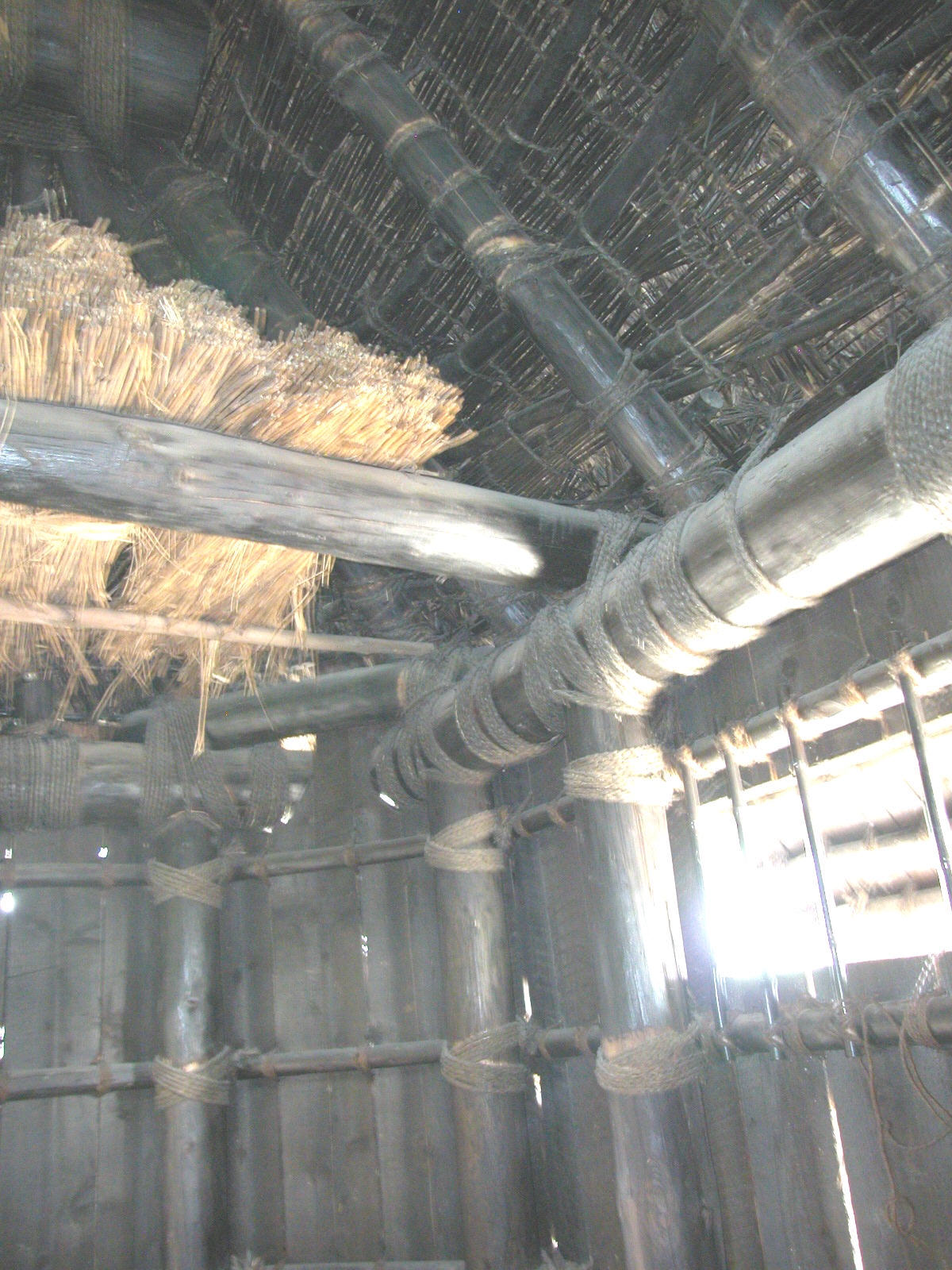 | There is only natural light peeking in through one window, so photography is difficult inside the structure. The upright and horizontal beams are approximately 8 inches in diameter and tied together with ropes. | The horizontal beams above are also used for storage areas. | ||